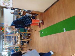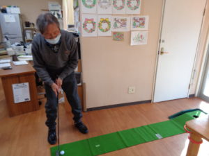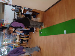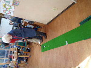 パターゴルフです。ゴルフ経験者は沢山おられます。懐かしいパターを握りカップイン目指して真剣勝負です。さすがにフォームも決まっています。