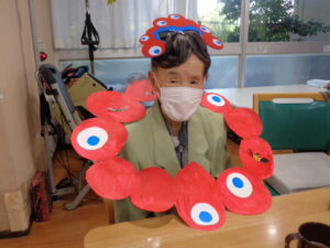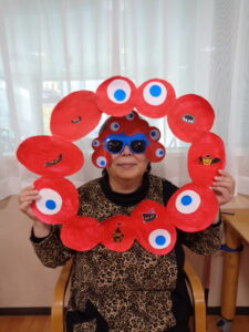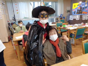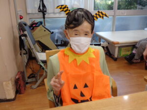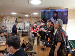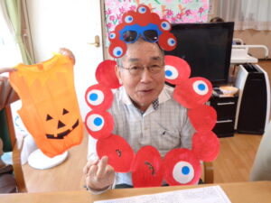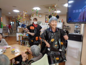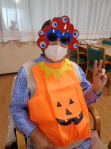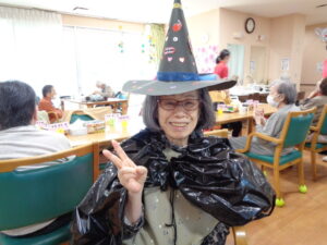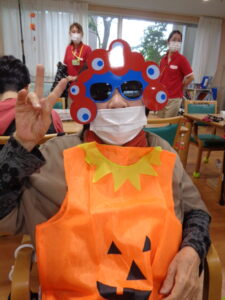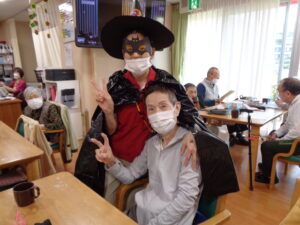 ゲスト様も職員も仮装して”ハイチーズ”とても笑顔で楽しそうです。おやつを食べながら歌ったり踊ったりしてとても華やかで賑やかな時間でした。