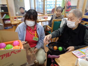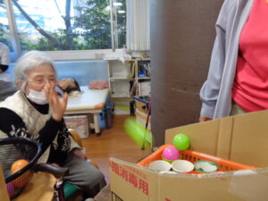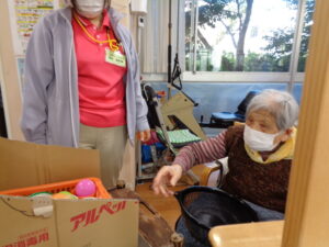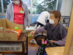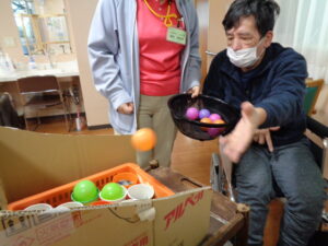 12月に入り師走ですね。一年がとても早く感じられます。あおまだにフロアーでは今日もレクリエーションで楽しんでいます。カゴの中にカップが並んでおりボールをカップに入れていきます。全部入るかな? 集中力が必要です。単純ですがとても面白いゲームです。