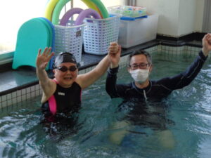 寒さに負けない身体作りです。プールの水温は33℃とスポーツクラブの水温と比べて2℃程高く快適に水中運動が可能です。もう12月に入りますがレクリエーションやフロア体操・プールトレーニング等楽しく頑張ってください。