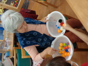ボール運びゲームです。カゴからカゴにスプーンでボールをすくって移動させるゲームです。簡単そうに見えて結構難しいです。とても良い指の鍛錬と集中力アップにもつながります。