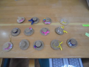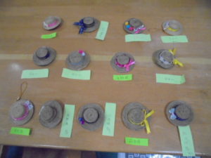キャップに糸を巻き飾りつけをします。小さいながらもとても可愛い麦わら帽子です。