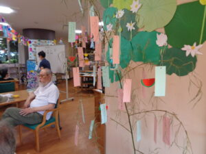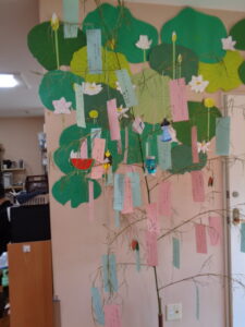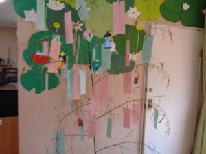 7月に入り、とにかく暑いです。危険なくらいの猛暑が続いています。フロア内はクーラーが効いていますが外出は控えたほうがよさそうです。フロアでは七夕祭りと笹の葉に思いを書き込み短冊に願います。