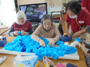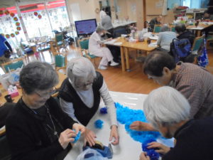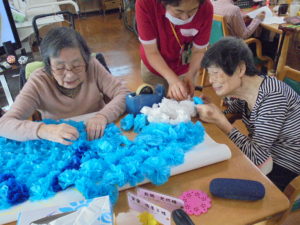 花紙を使ったもので、花を作る方、張ってもらう方に分かれ作業は順調❣
