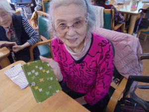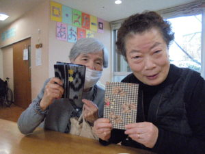 先週実施したものつくりレクで、保険証入れが1日で完成しなかったゲスト様方がまた来所された際に仕上げていただきました‼