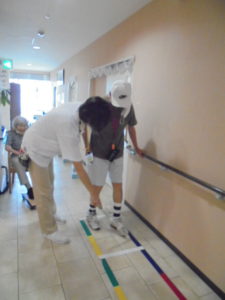 ●4色に色分けしたハシゴ型のテープを色を言いながら進みます。