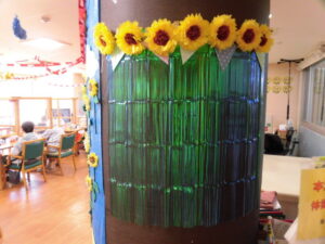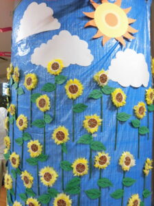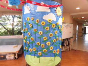 夏も早くも終わりです。あおまだにでは夏の終わりに可愛いひまわりの壁面飾りをしましたのでご報告いたします。