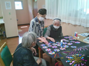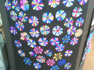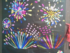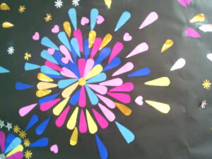 色紙を細かく色鮮やかに切り取り、花火が打ちあがったように貼り付けていきます。細かな作業ですが完成すると、とても綺麗です。