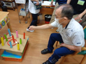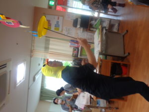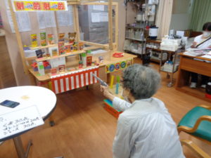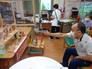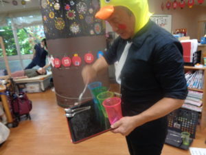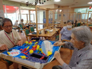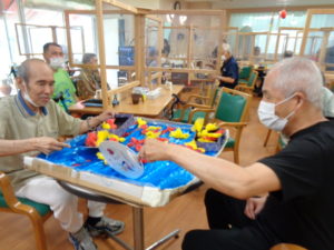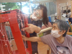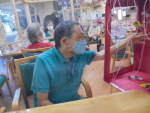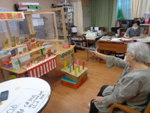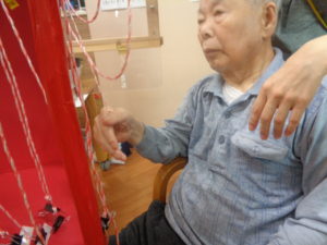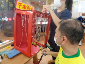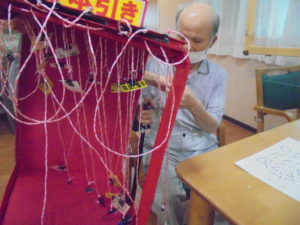 千本引きゲームです。職員の手作りです。どれか一本引くと何かが上がっていく仕組みです。