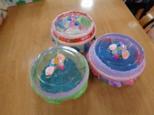 透明なカップにオリジナルに飾り付けをしてとてもお洒落な可愛い小物入れの完成です。