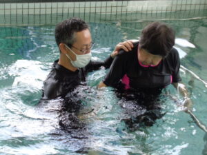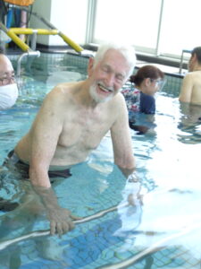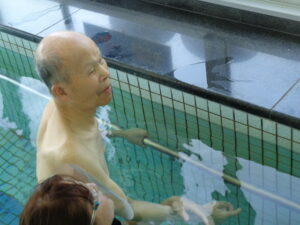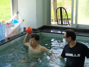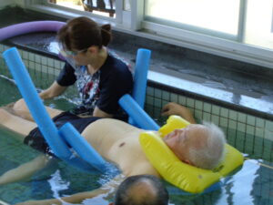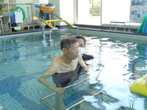 プールリハビリです。水の特性を活用して様々な水中運動を実施します。夏は特に気持ちいいです。大人気の水中運動です。