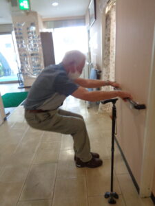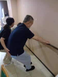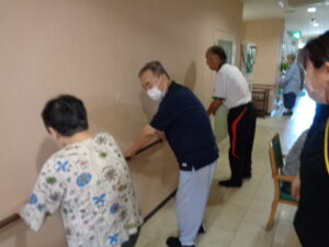 廊下体操です。主に下肢筋肉を維持・強化する目的で実施しています。結構きついです。
