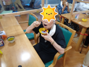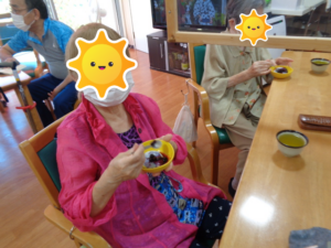 ここ神明会では、暑い中すくすくと育ったブルーベリーを収穫し、ゲスト様へおやつ時に提供しました。