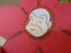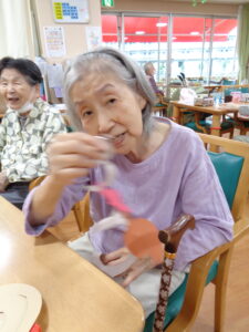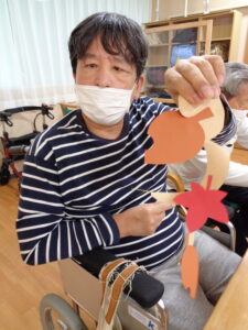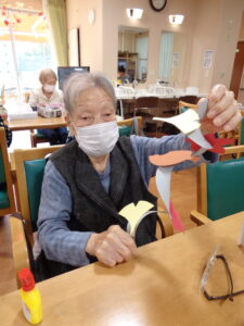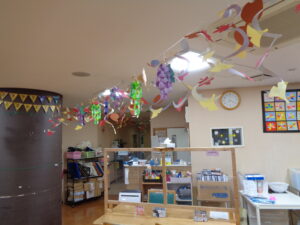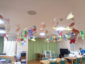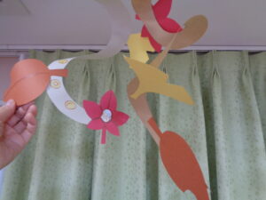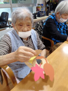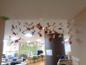 画用紙をクルクルと切り取り紅葉の葉を付けていきます。とても綺麗に飾られています。風が吹くとクルクル揺れます。あおまだにフロアでは季節に合した飾りつけをしています。