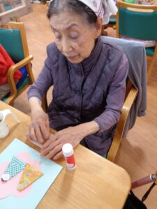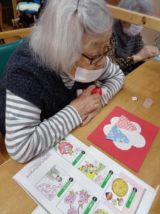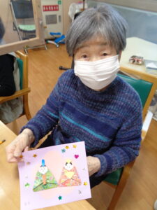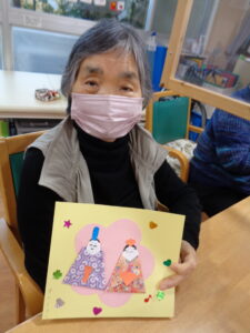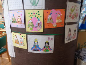 2月も早くも残りわずかとなりました。季節が流れるのはとても早いですね。オリジナルの雛人形の作成です。折り紙を折り顔を書いて色んな模様を付けていきます。とても可愛いです。