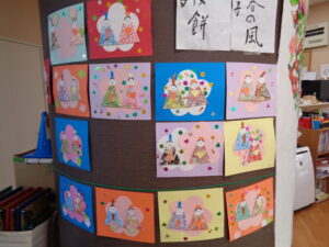 とても可愛いオリジナル雛人形です。壁面に飾りつけました。今後も季節に合わせて壁面作成も実施してまいります。