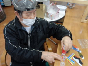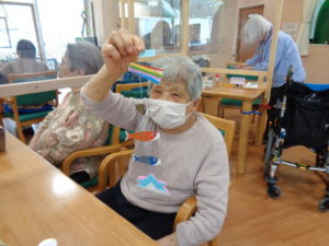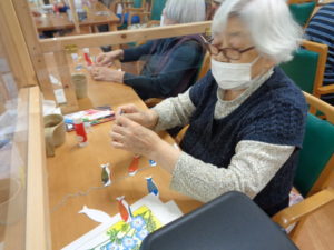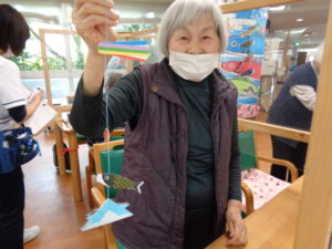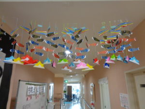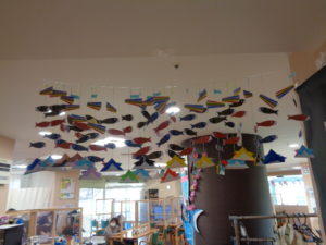 4月も中旬に入り5月行事の鯉のぼり吊るし飾りを取り組んでいます。一匹づづ紐に吊るしてバランスをとります。簡単そうみ見えて難しそうです。一番下の兜が重りの役割をしています。