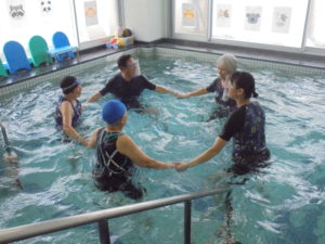 プールトレーナーもゲスト様も一緒に手をつないでトレーニングです?