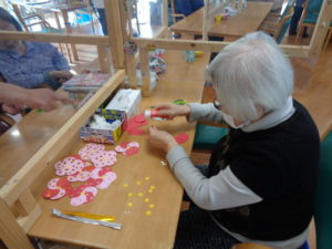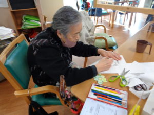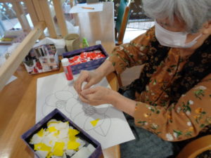 色画用紙を切り抜き模様付けです。色を塗り飾り付けるゲスト様もおられます。