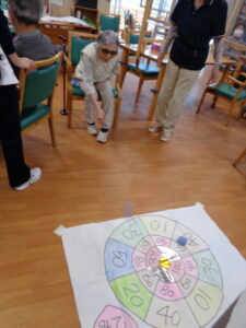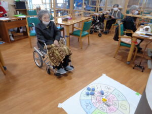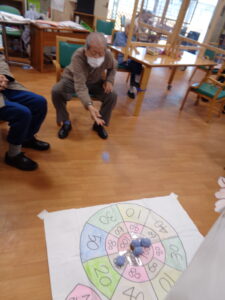 床ダーツゲームです。ボールを投げて点数を争います。意外と熱が入り面白いです!!