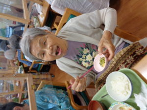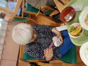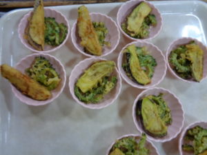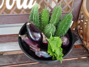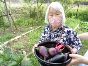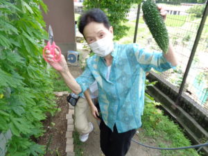 ディサービスの畑で収穫したゴーヤ・ナスを天ぷらにして昼食で試食していただきました。立派な丸々太った夏野菜です。