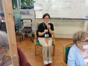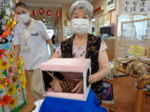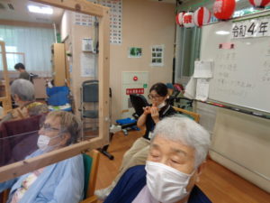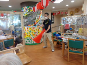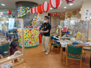 7月に入り縮小版の”ミニ夏祭りを開催しました。フロアーに提灯を飾り付けて祭りの音楽を流し雰囲気を盛り上げます。ゲスト様には職員のかくし芸で楽しんでいただきました。