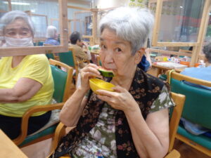 スイカ割りゲームはおもちゃのスイカでしたが、皆さんで本物のスイカを食べました。とても甘く美味しそうでした。