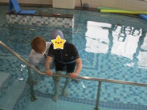スタッフの補助ありで泳いだりして全身の運動を行なっております爆  笑