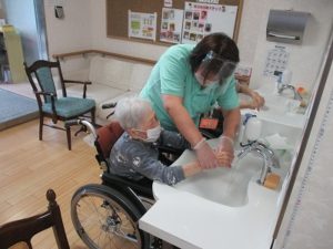 手洗いの基本を口頭で説明した後、爪切りを済ませ