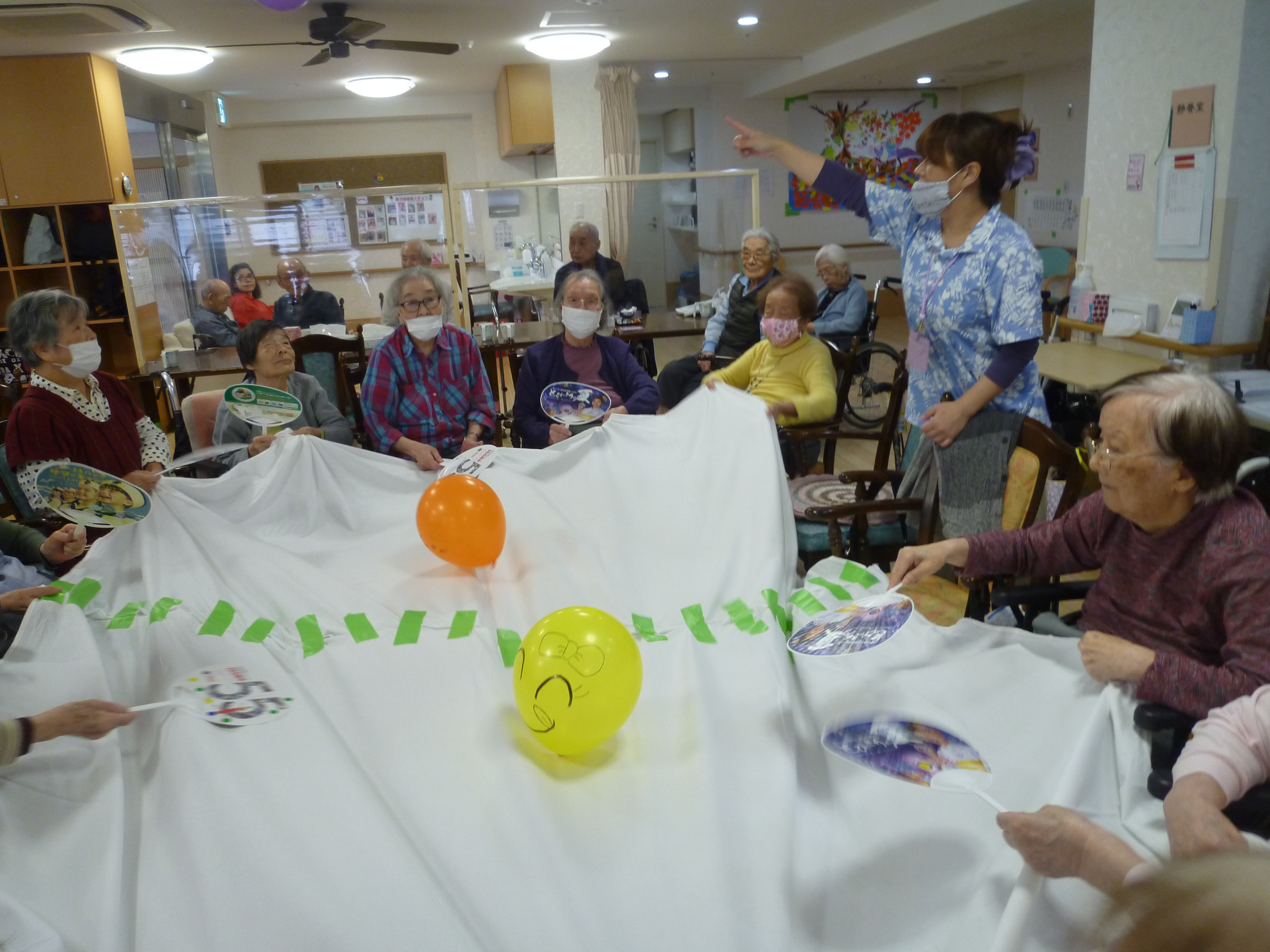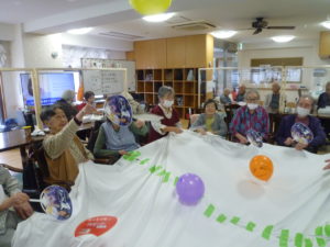 大きな布を使い皆様で包んだり、物を動かすレクリエーションですニコニコ音譜