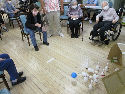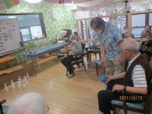 紅白にチーム分けし、まずは個人戦でボーリング