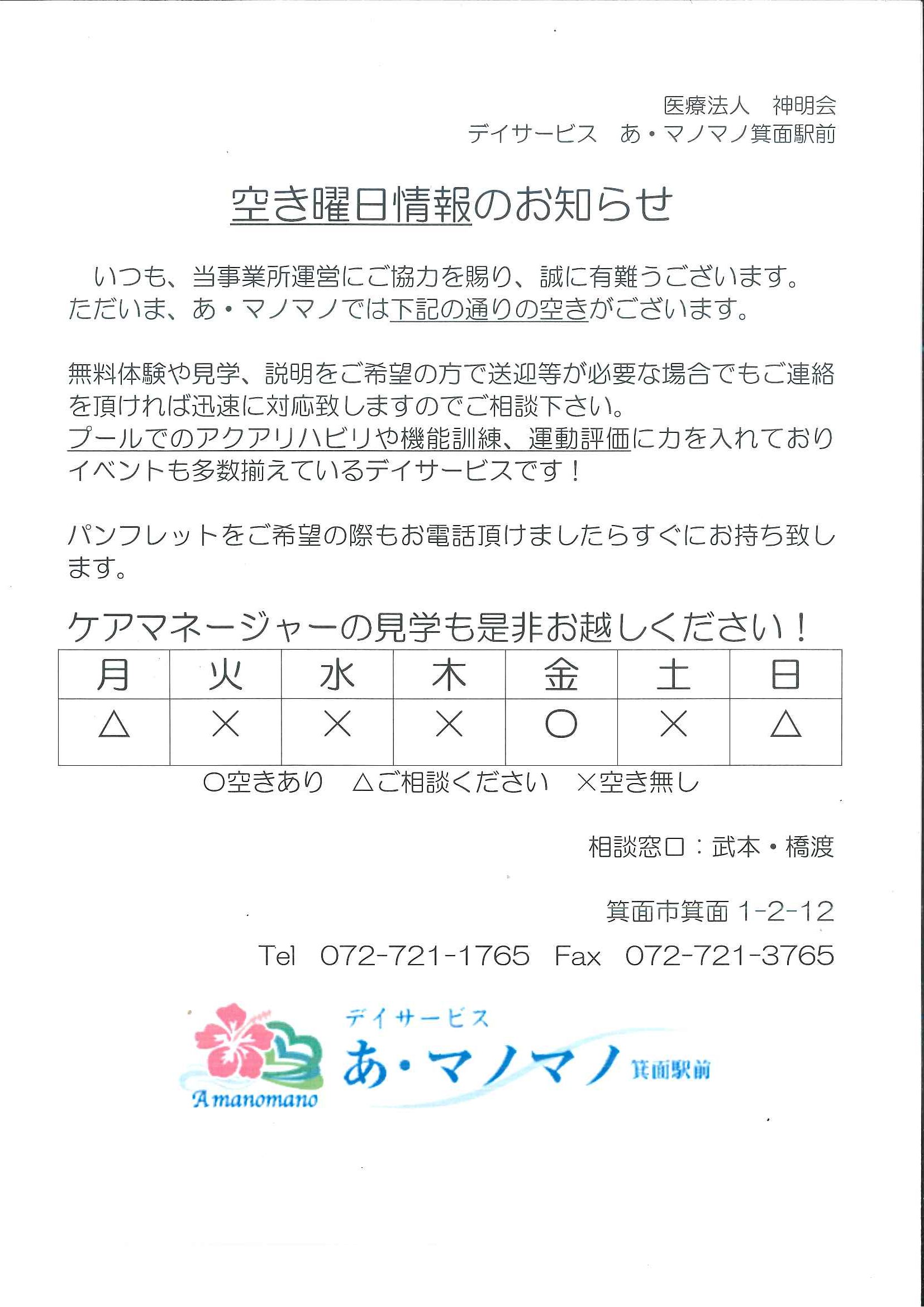 あ・マノマノから現在の空き曜日情報のお知らせです![]()