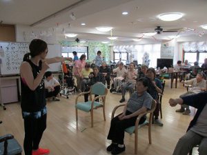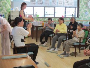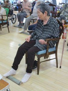 青竹ビクスは足裏?のツボを刺激し全身の血行を促進する効果があるという事で皆さんに靴を脱いでもらいました。音楽?のリズムに合わせて青竹を踏みながら手の動きも加えた運動です?