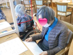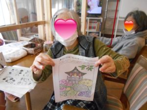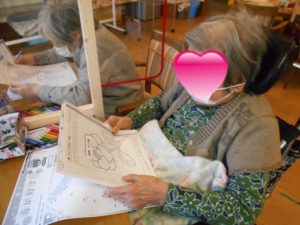ラ・ソーラもりぐちでは午前に脳トレのプリントその後は季節のぬりえの色塗りに取り組んでもらっています?