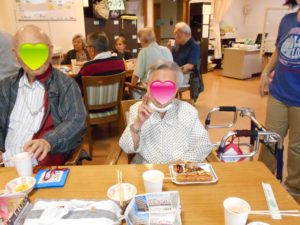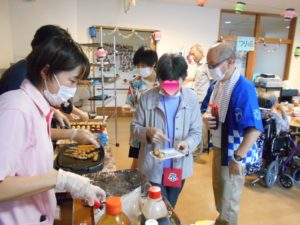 お食事も屋台で職員が売り子に扮して、たこ焼き、お好み焼き、フランクフルト、焼き鳥、バターコーンそれぞれ好きなものを好きなだけ味わってもらいました?