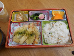 タケノコの天ぷら、菜の花のお浸し、フキの煮物など旬の物がたっぷりのお弁当です?