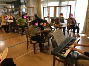スタッフによるピアノ演奏で春にふさわしい「花」と「川の流れのように」で皆さんで合唱しました