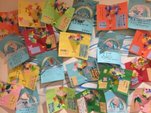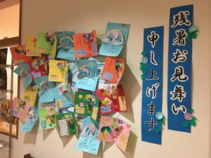 カードが出来ると残暑見舞いを出したい相手に対して思い思いの言葉を書いてもらいました