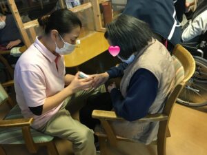 ラ・ソーラもりぐちデイサービスではリラクゼーションタイムでマッサージや爪のお手入れを行いました