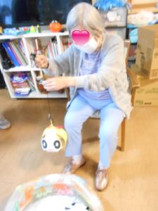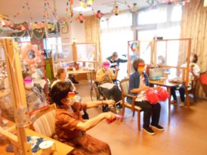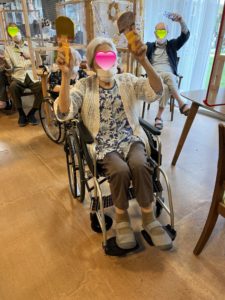 ソーラン節やお祭りマンボの曲に合わせ手作りの鳴子やポンポン、マラカスを持って鳴らして皆さんノリノリで大盛り上がりでした??