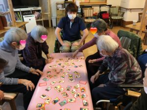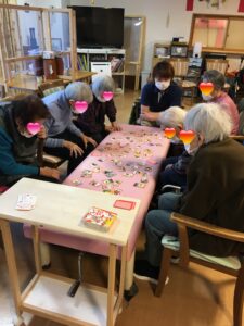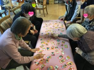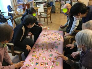 いつもは機能訓練で使うベッドにかるたを並べいざ勝負!!