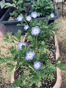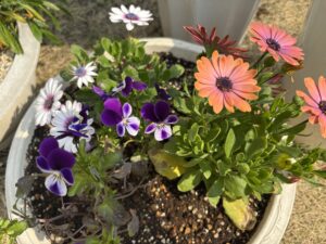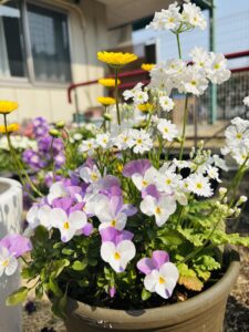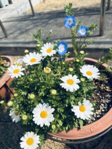 青いお花:ネモフィラ 白いお花:ノースポール,サクラソウ,ビオラ
