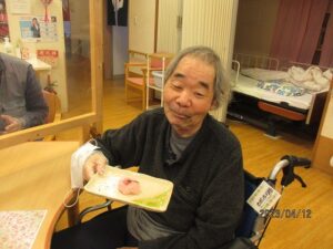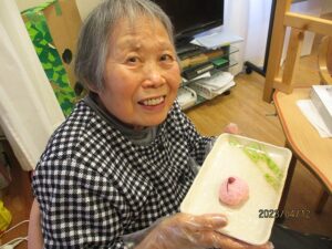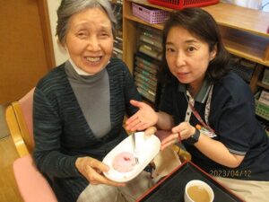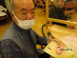 今日はおやつレクで皆様に桜餅をニギニギしていただきました