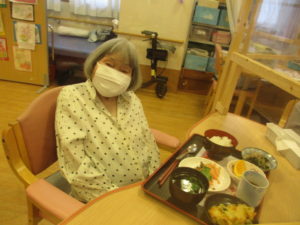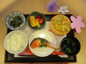 ・鮭茶漬け ・玉ねぎのかき揚げ ・ほうれん草のお浸し ・果物