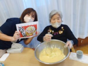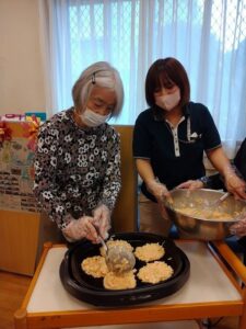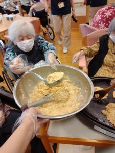 生地にキャベツ・ちくわ・紅ショウガ・天かすを皆さんに混ぜて頂きました