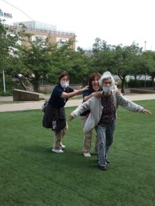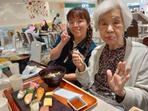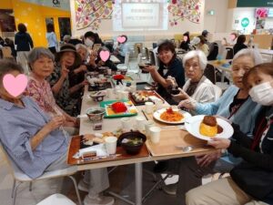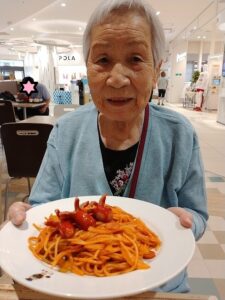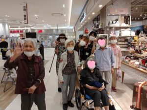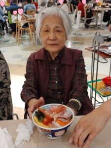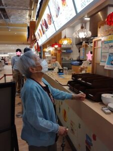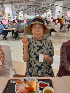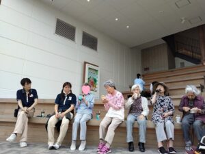 食後、広場でおやつを食べながら、ゆっくりと休憩しています。皆様はそれぞれ違うもの買って、召し上がられています。