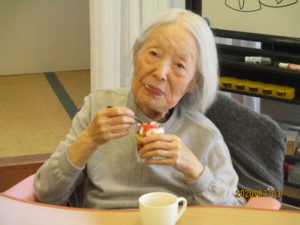 おやつレクではパウンドケーキをカップの中に盛り付け