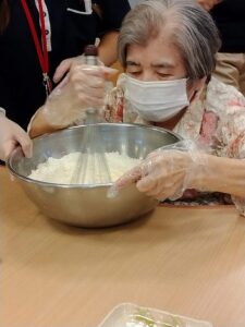 皆さんでホットケーキ生地を作り、じゃが芋を揚げ焼きして頂きました