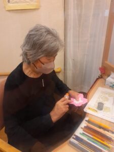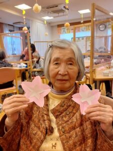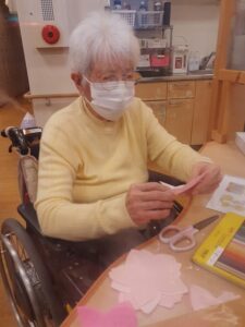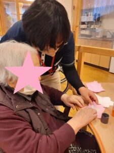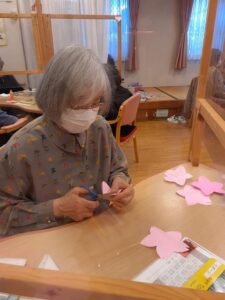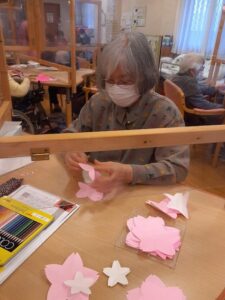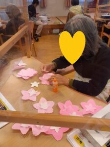 桜の壁面作りで、皆さんと一緒に折り紙で桜をたくさん制作中です