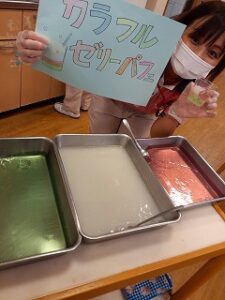 3色の綺麗なゼリーをカップに入れ、アイスクリームをトッピング